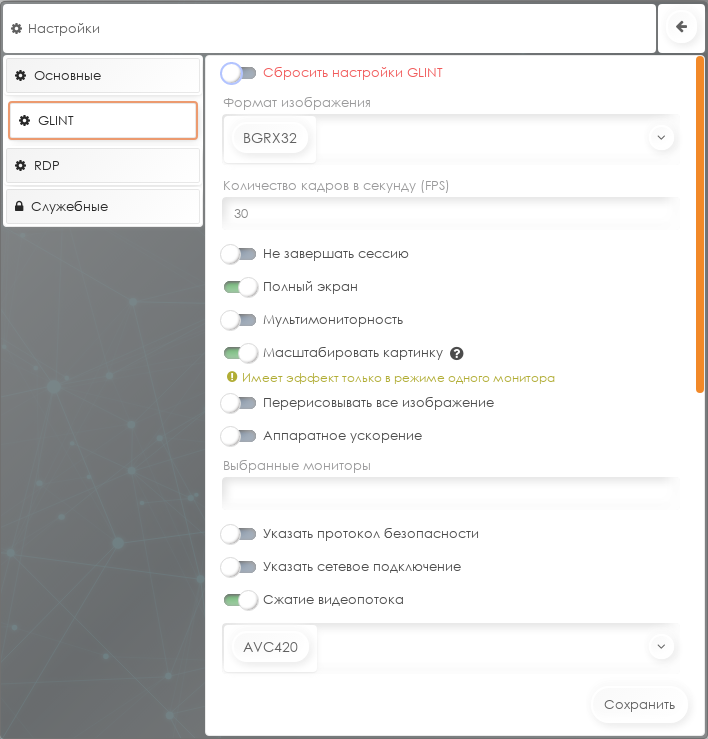 При активации параметра и подключении по протоколу GLINT создается сессия с поддержкой аппаратной видеокарты. Видеокарта должна быть заранее перенаправлена на виртуальную машину средствами SpaceVM. Руководство по перенаправлению видеокарты содержится в статье PCI-устройства.