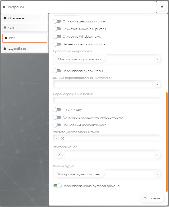 Настройка влияет на отображение визуальных стилей и тем оформления на удаленном рабочем столе.