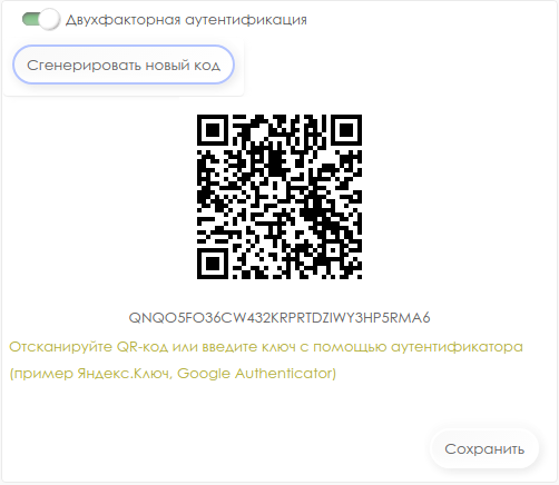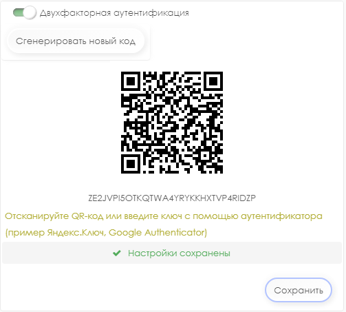 При включении двухфакторной аутентификации при каждой авторизации будет требоваться одноразовый пароль, генерируемый приложением-аутентификатором (система тестировалась с приложениями: Яндекс.Ключ, Google Authenticator).