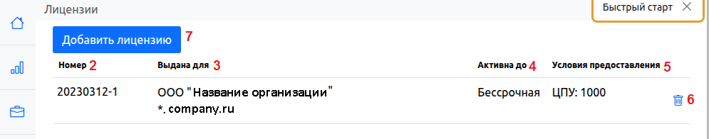 Колонка «Номер» (2) содержит номера добавленных лицензий.