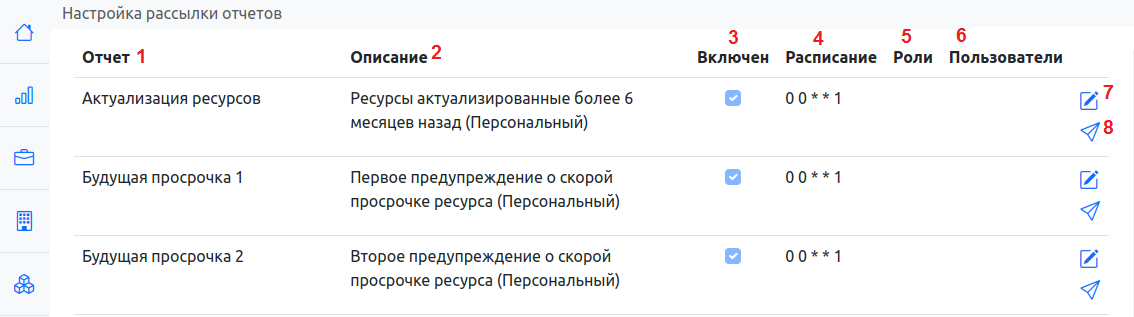 Колонка «Включен» (3) отражает статус активации рассылки отчёта.