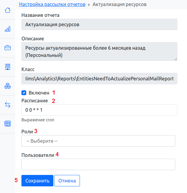 Колонка «Роли» (5) отражает заданный для рассылки отчёта список ролей.