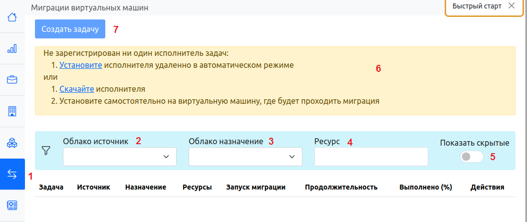 При наличии предупреждения «Не зарегистрирован ни один исполнитель задач» (6) необходимо установить и зарегистрировать хотя бы один Исполнитель задач миграции на сервере, где будет происходить процесс миграции. Подробное описание процесса размещено соответствующей статье.