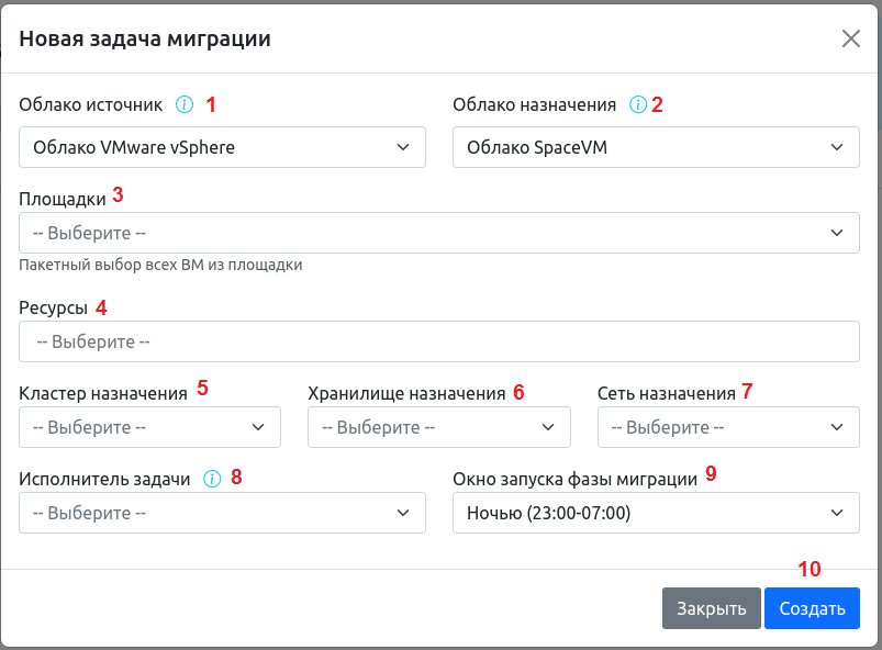 «Площадки» (опционально) (3) – пакетный выбор всех ВМ указанной площадки, предназначенных для миграции из выбранного облака источника.