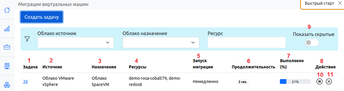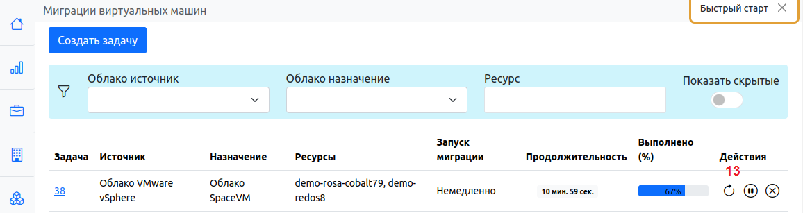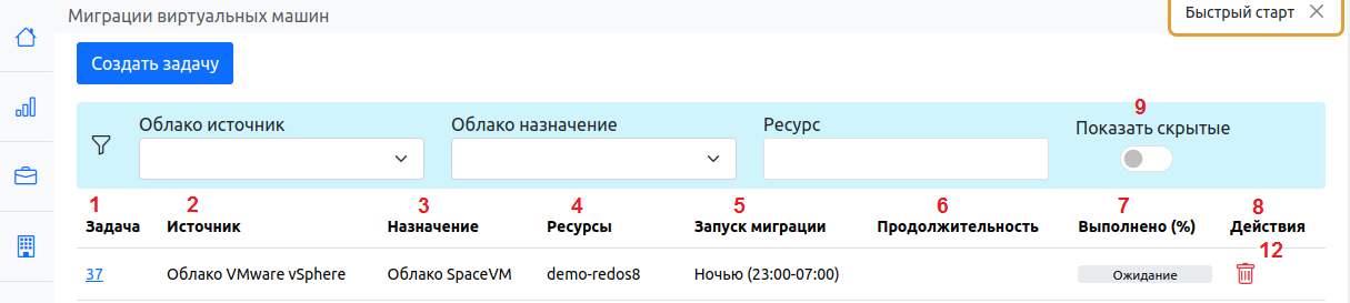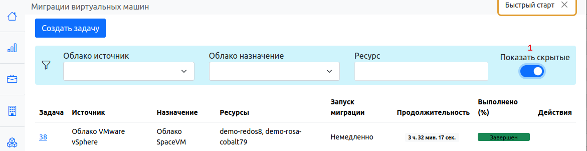 Для оптимизации отображения ранее созданных задач миграции доступна фильтрация по полям «Облако источник» (2), «Облако назначения» (3) и «Ресурс» (4). Опция «Показать скрытые» (5) управляет отображением «архивированных задач».