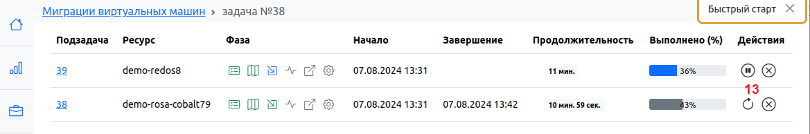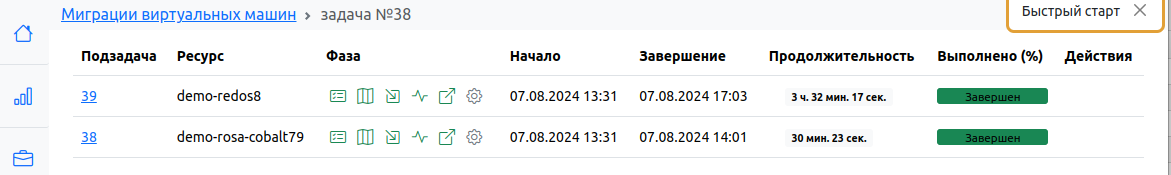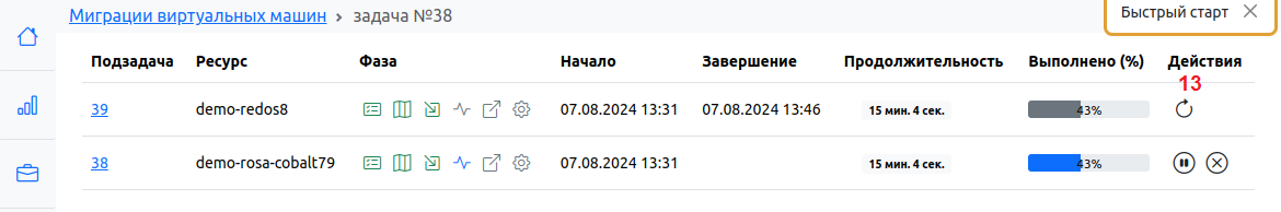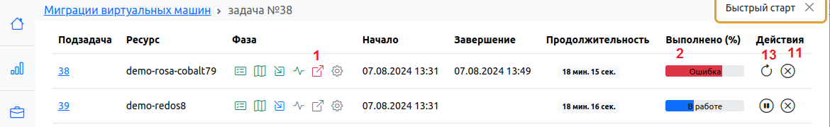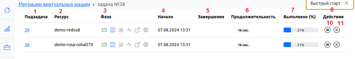 «Фаза» (3) отображает фазу выполнения подзадачи. Значок фазы в стадии выполнения окрашен в синий цвет. Значки завершённых фаз зелёного цвета. Значок в статусе ошибки красного цвета. Подзадача миграции представлена следующими фазами: