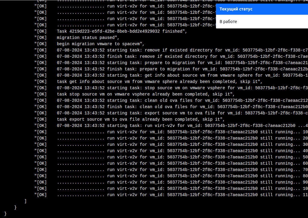 «Выполнено (%)» (7) отображает приблизительную долю в процентах выполненной подзадачи от общего объёма или статус выполнения подзадачи. Точное значение доли выполненной подзадачи зависит от множества факторов, связанных с конкретной целевой ВМ.