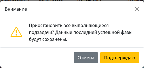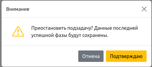 Действие «Приостановить» (10) на уровне подзадачи становится доступным после прохождения первой фазы. На уровне задачи действие «Приостановить» доступно, если оно доступно на уровне одной из её подзадач. На уровне подзадачи действие «Приостановить» распространяется на конкретную подзадачу. На уровне задачи действие «Приостановить» распространяется на все подзадачи, для которых доступно это действие. При нажатии «Приостановить» появляется запрос на подтверждение действия для задачи и или подзадачи.
