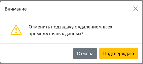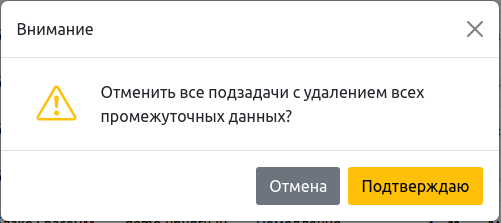 Действие «Отменить» (11) доступно для подзадачи в статусе «В работе», «Приостановлена» и «Ошибка». На уровне задачи действие «Отменить» доступно, если оно доступно на уровне одной из её подзадач. На уровне подзадачи действие «Отменить» распространяется на конкретную подзадачу. На уровне задачи действие «Отменить» распространяется на все подзадачи, для которых доступно это действие. При нажатии «Отменить» появляется запрос на подтверждение действия для задачи.