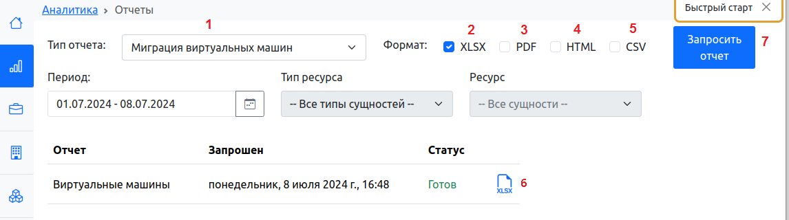 Нажатие «Запросить отчёт» (7) ставит в очередь создание отчёта с указанными параметрами.