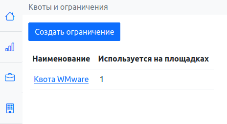 Раздел «Квоты и ограничения» служит для создания, изменения и удаления квот и ограничений на выделение вычислительных ресурсов для площадок.