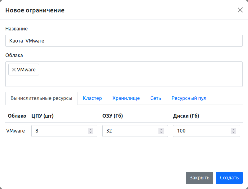 «Добавить облако» – добавление доступного для квот облака в редактируемое ограничение. После добавления для облака необходимо определить квоты на «Вычислительные ресурсы», «Кластеры», «Хранилища», «Сети» и «Ресурсные пулы».