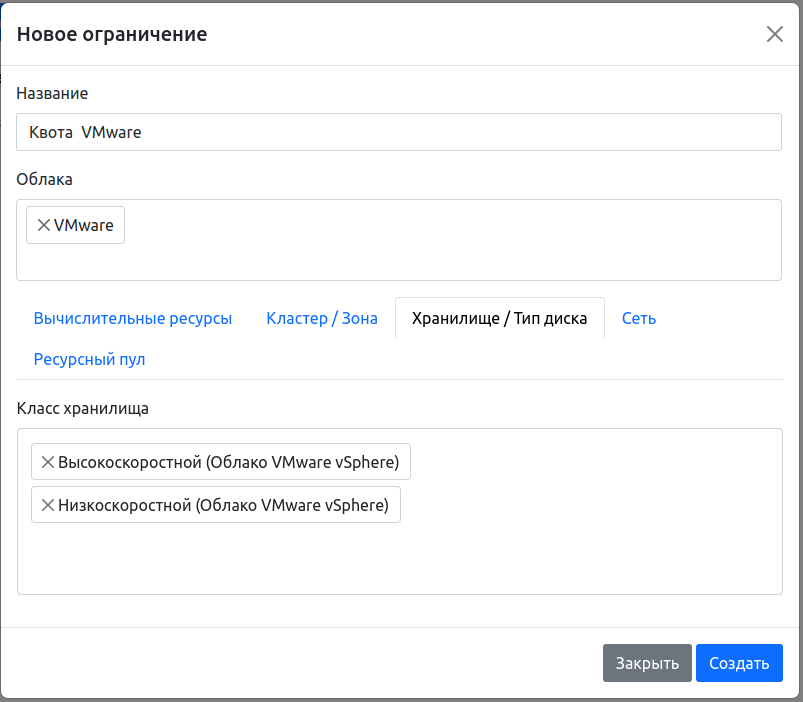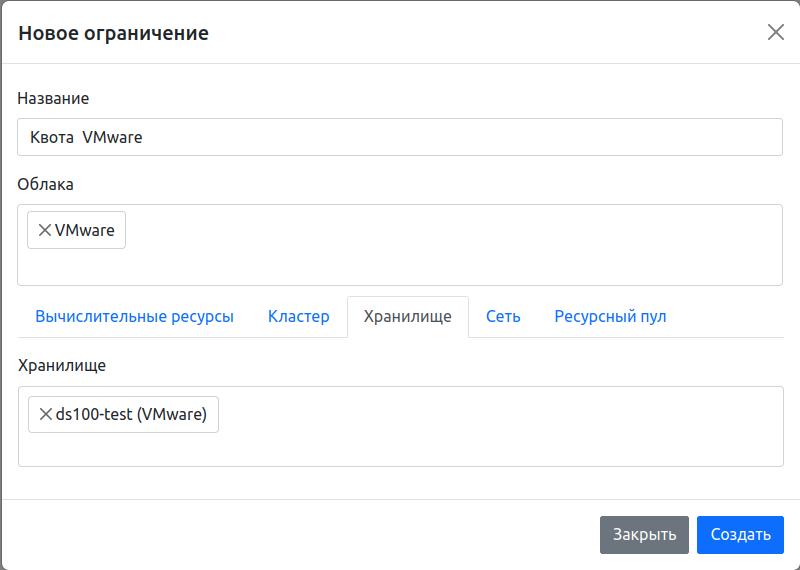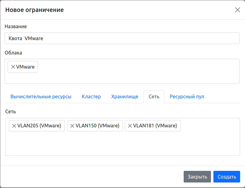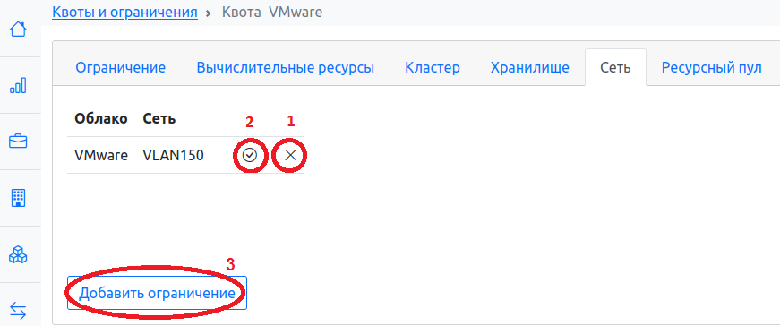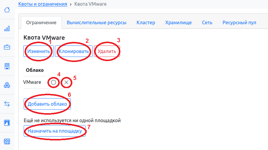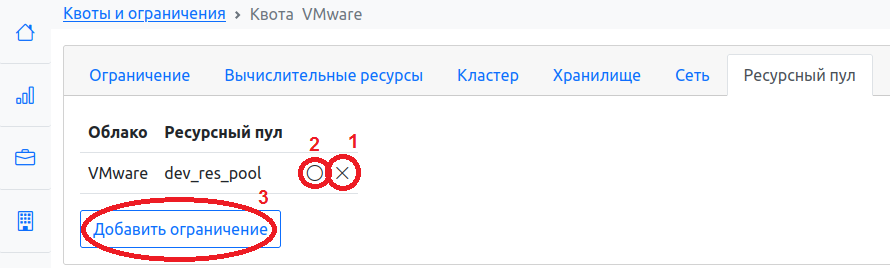 «Убрать из ограничения» (5) – удаление из ограничения выбранного облака вместе с зависимыми квотами на «Вычислительные ресурсы», «Кластеры», «Хранилища», «Сети» и «Ресурсные пулы».