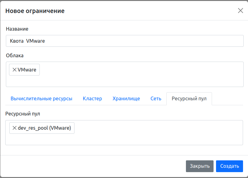 В закладке «Ресурсный пул» определяются квоты нового ограничения на доступные ресурсные пулы.