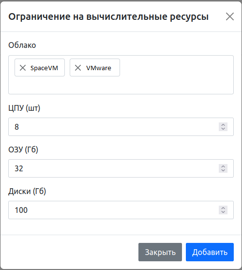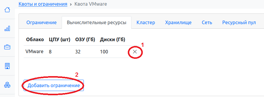 Закладка «Вычислительные ресурсы» предоставляет возможность удалять (1) и добавлять (2) ограничения на вычислительные ресурсы для доступных облаков.
