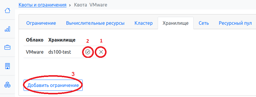 Закладка «Хранилище» предоставляет возможность удалять (1), назначать по умолчанию (2) и добавлять (3) хранилища, на которые будут распространяться квоты на диски в редактируемом ограничении. Для добавления доступны хранилища из выбранных для ограничения облаков.