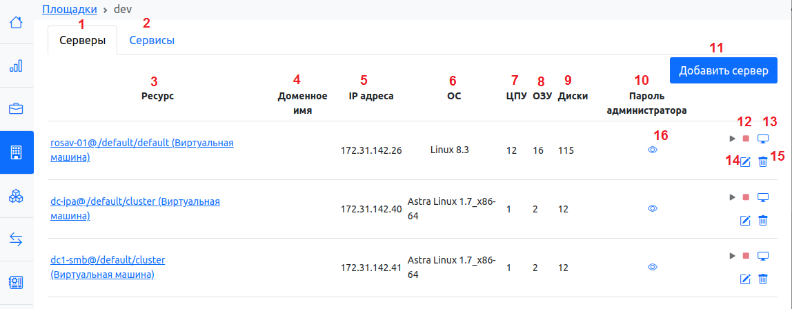 Нажатие по имени площадки отобразит развёрнутую информацию о её ресурсах. Ресурсы представлены на соответствующих вкладках «Серверы» (1) и «Сервисы» (2).