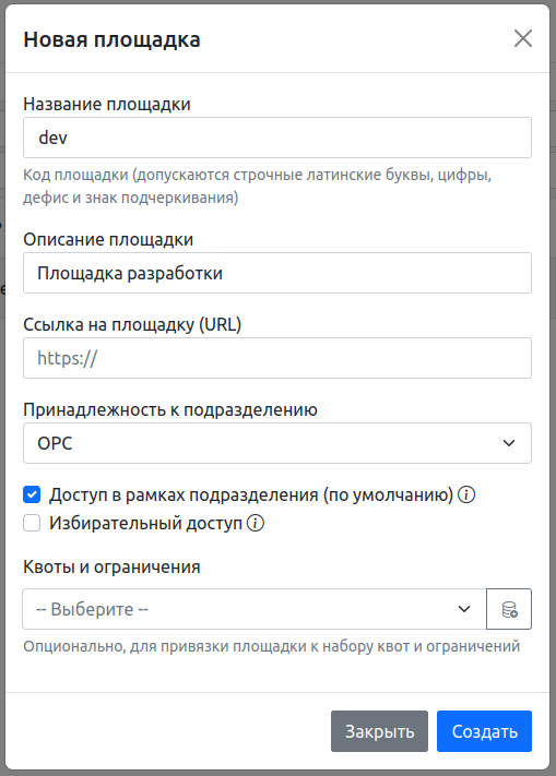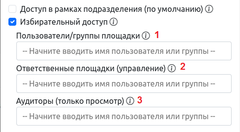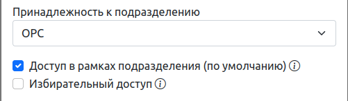 «Доступ в рамках подразделения (по умолчанию)» — опционально, определяет предоставление доступа к площадке для пользователей выбранного и вышестоящих подразделений (но не нижестоящих).