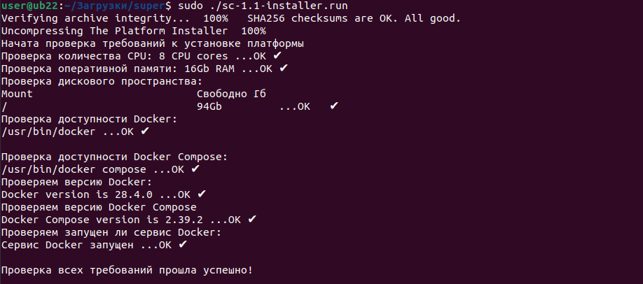 sudo ./<installer_name>.runНачнется проверка целостности и распаковка файла установщика. Производится проверка ВМ на соответствие требованиям к установке платформы. В случае успешной проверки отобразится сообщение: «Проверка всех требований прошла успешно!».