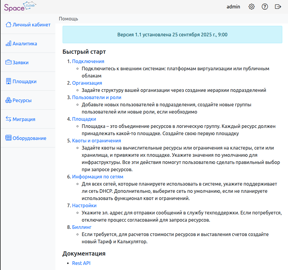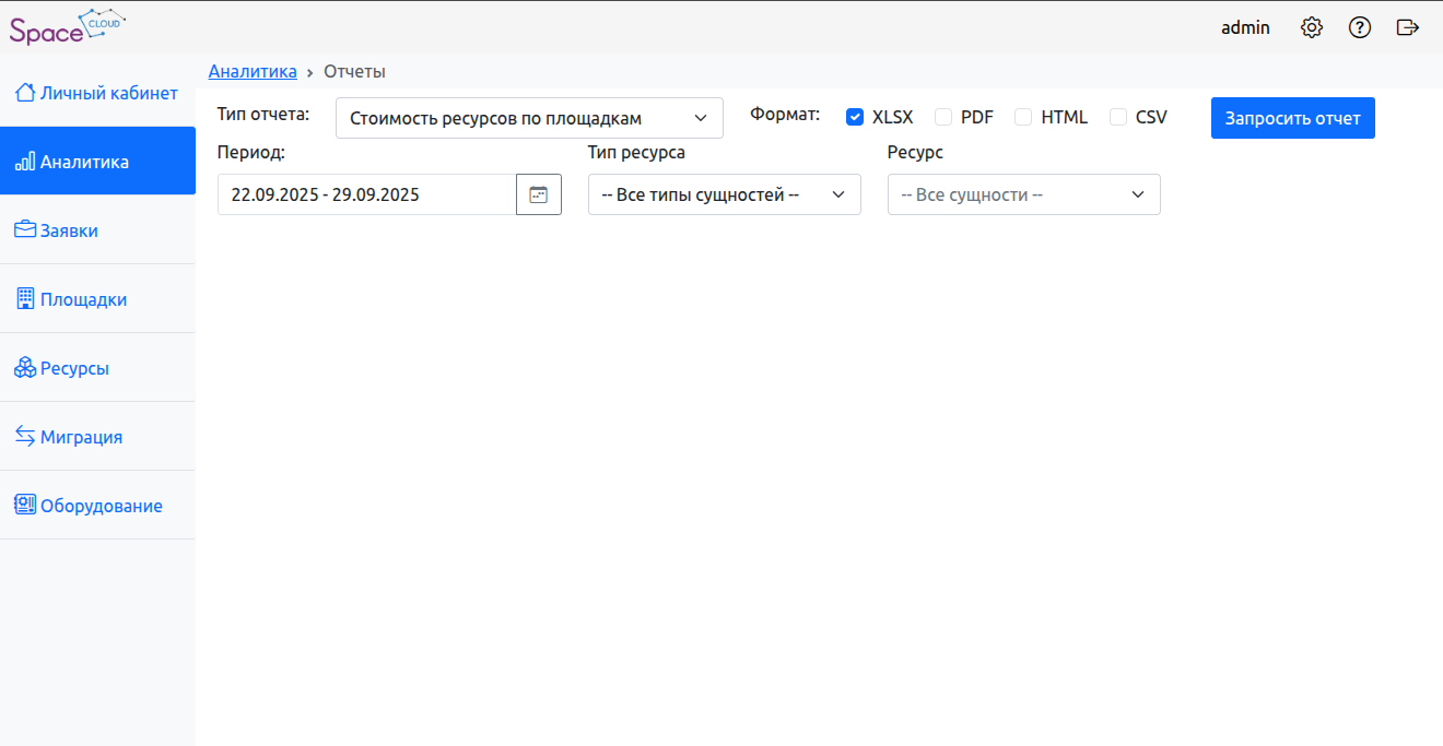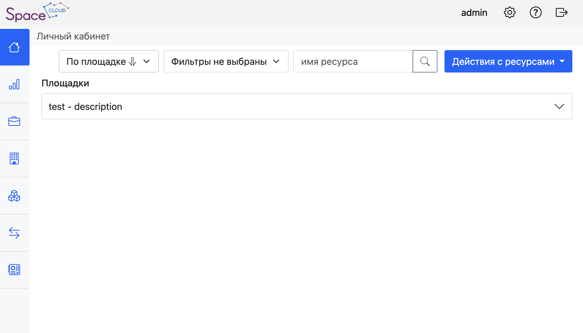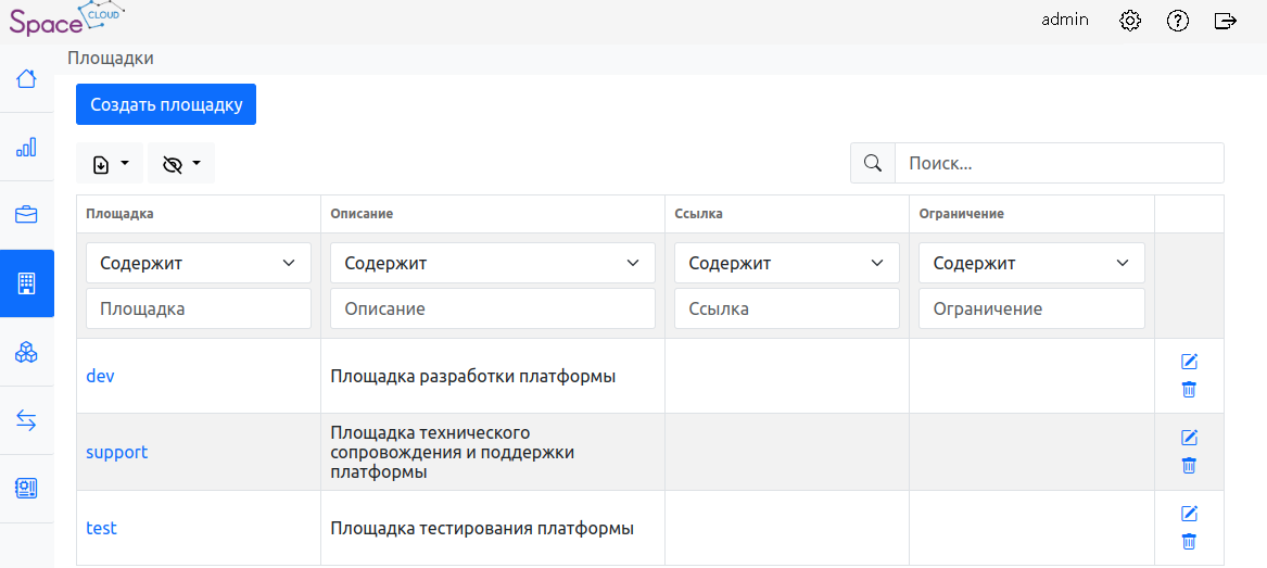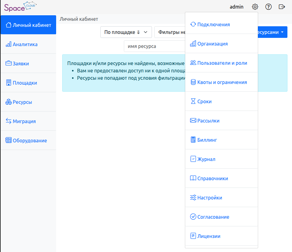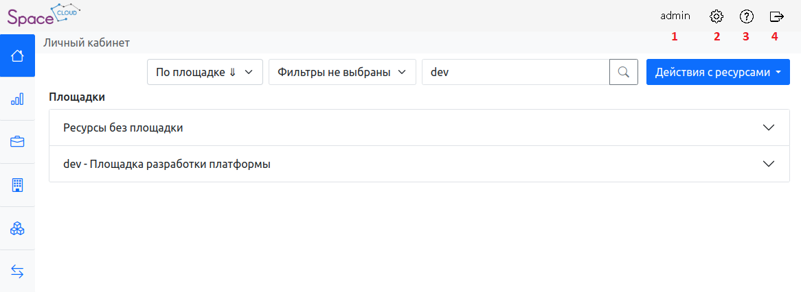 Площадки – информация о доступных площадках и их ресурсах.