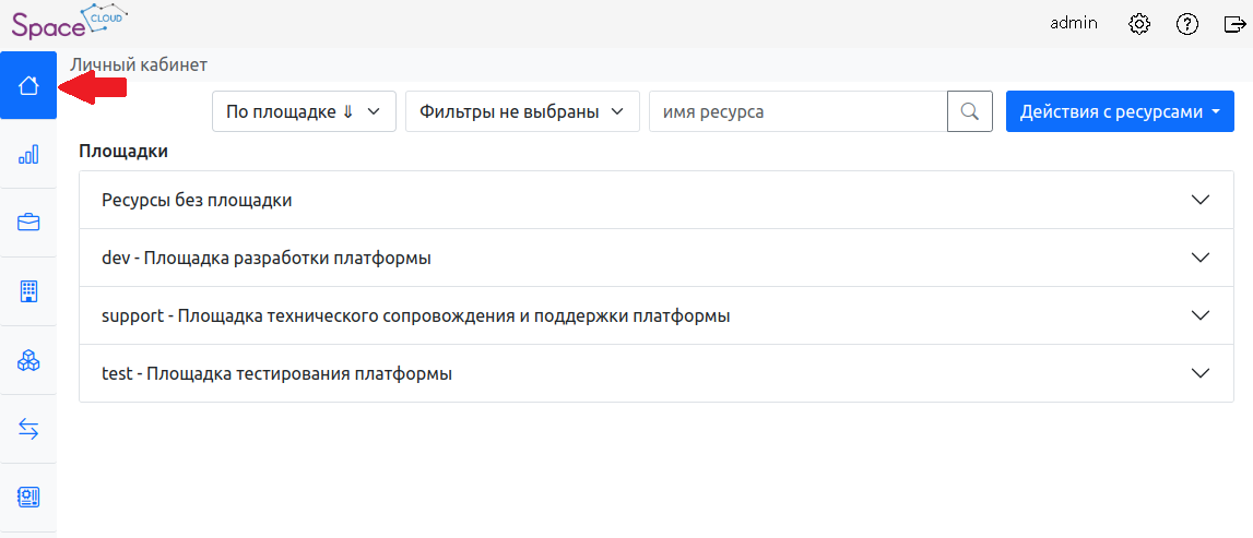 Ресурсы сгруппированы по площадкам. Для доступа к списку ресурсов, необходимо нажать имя соответствующей площадки.