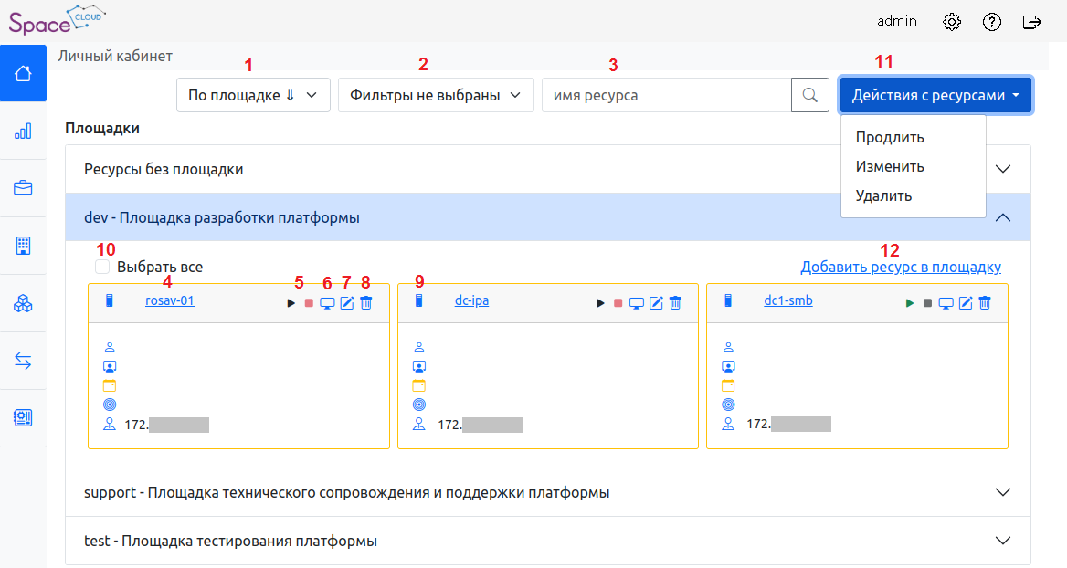 - Для оптимального отображения ресурсов предусмотрена фильтрация (2) по состоянию, принадлежности и площадке.