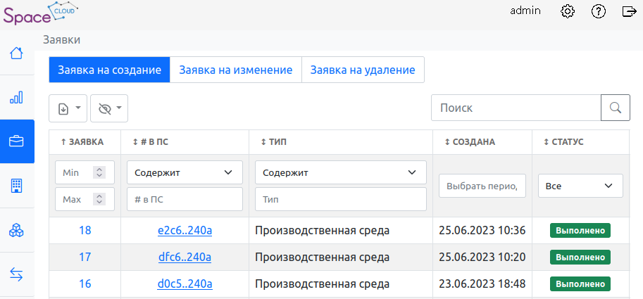 Для создания заявки на выделение нового ресурса необходимо нажать на кнопку «Заявка на создание» в разделе «Заявки».