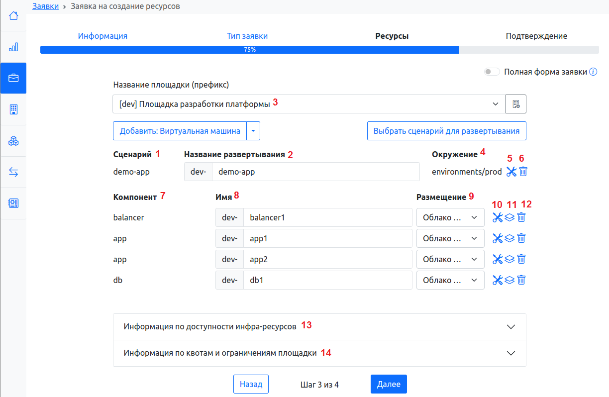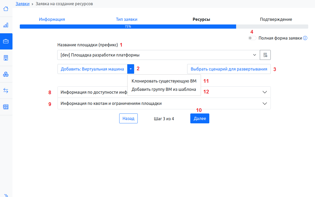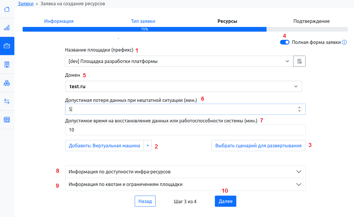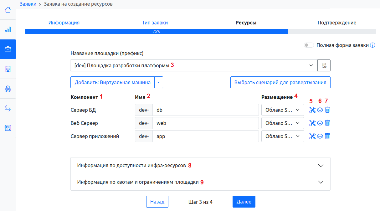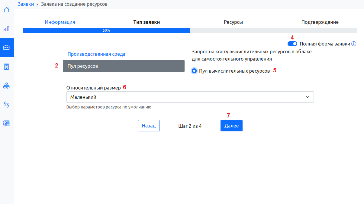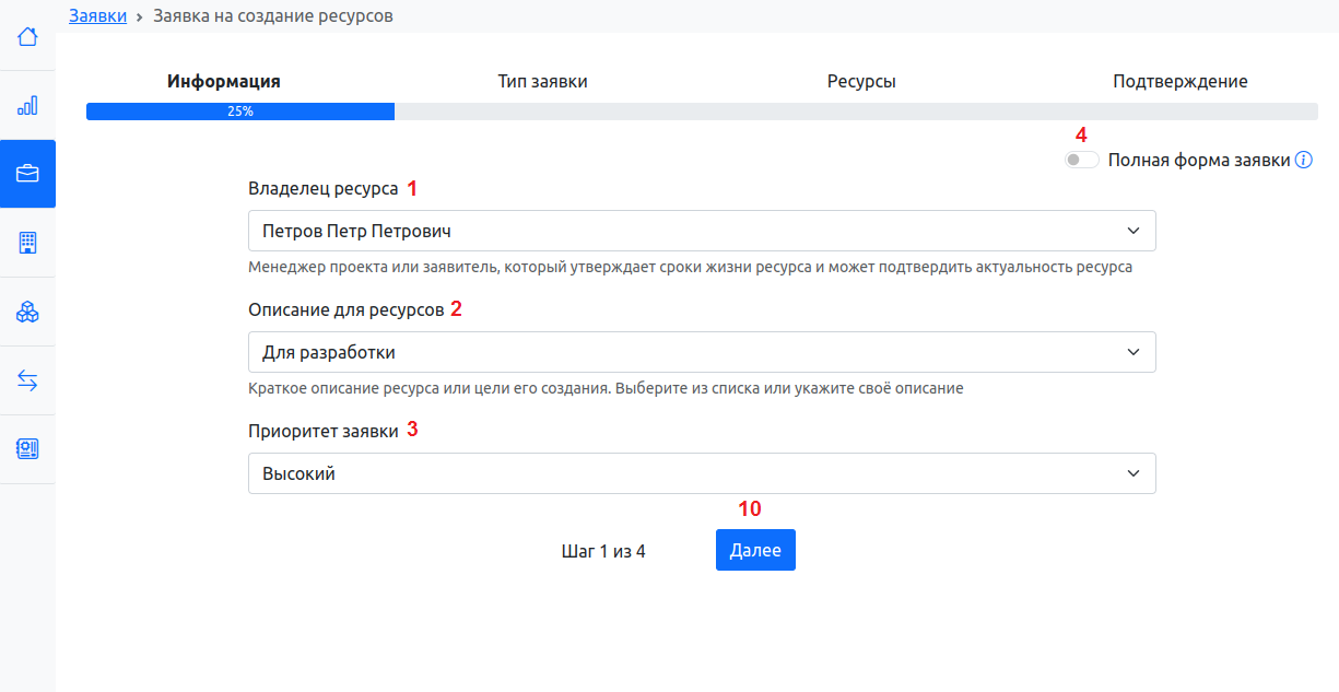 Для перехода этапу определения ресурсов в заявке необходимо нажать «Далее» (7).