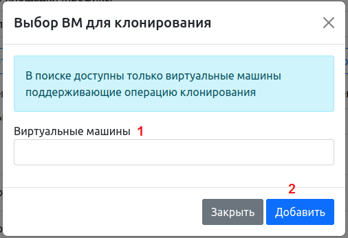 - В поле «Виртуальные машины» (1) необходимо ввести минимум 3 символа из имени предназначенной для клонирования ВМ.