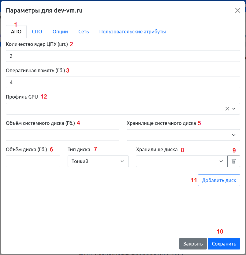 Вкладка «АПО» (1) определяет параметры вычислительных ресурсов ВМ.