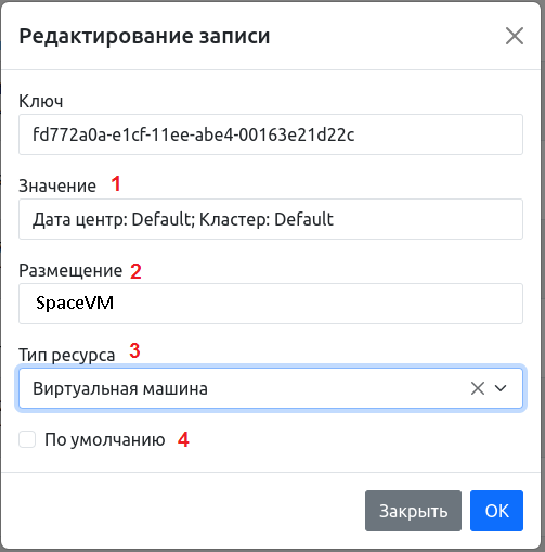 Пользователю с правами администратора доступно определение кластера (1) по умолчанию (4) для различных систем виртуализации (2) и типов ресурса (3) в справочнике «Кластер».