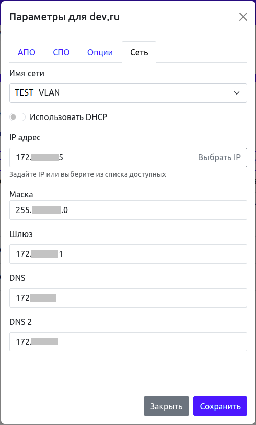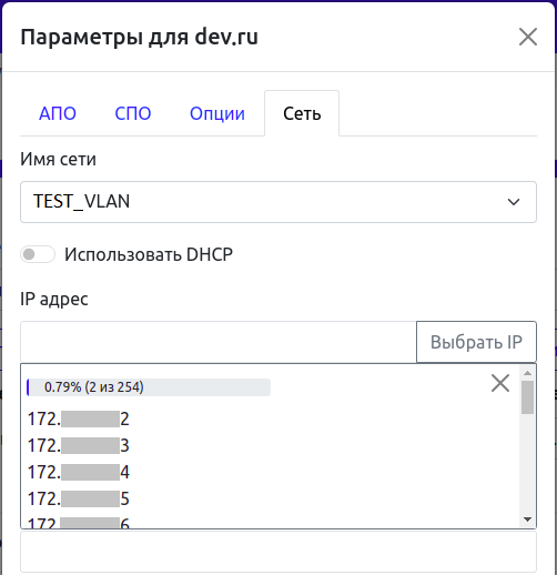 При наличии внешнего провайдера IPAM, подключённого к платформе, необходимо нажать «Выбрать IP» (9) для получения списка доступных IP-адресов выбранной сети.