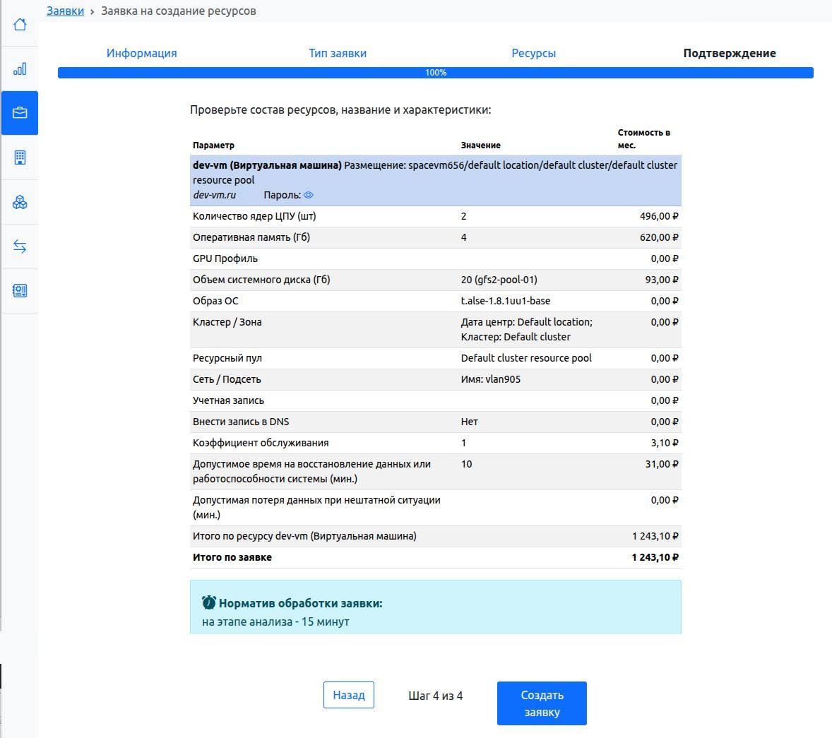 На последнем этапе необходимо проверить состав, названия и характеристики ресурсов для сформированной заявки. При необходимости внести изменения.