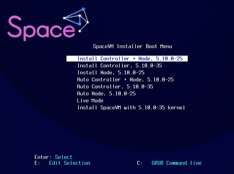 Допускается установка SpaceVM в роли Controller + Node (контроллер и сервер виртуализации) на один физический сервер, а также установка различных ролей на разные физические серверы.