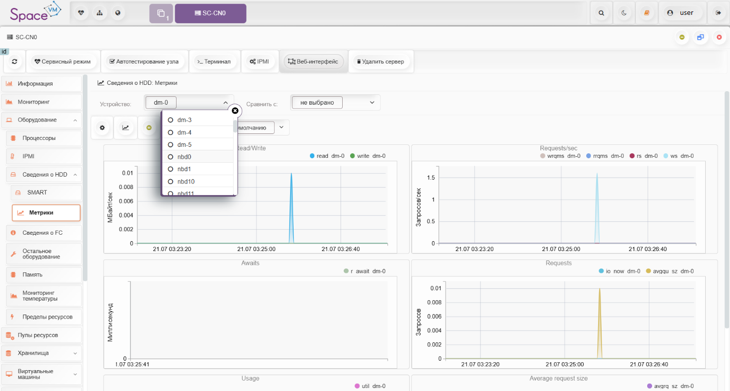 Для серверов в составе кластера доступны функции мониторинга HDD, позволяющие просматривать различные параметры как в реальном времени, так и за выбранный период. Чтобы просмотреть информацию о хранилище сервера, необходимо перейти в раздел Серверы – <Имя сервера> – Оборудование – Сведения о HDD – Метрики.