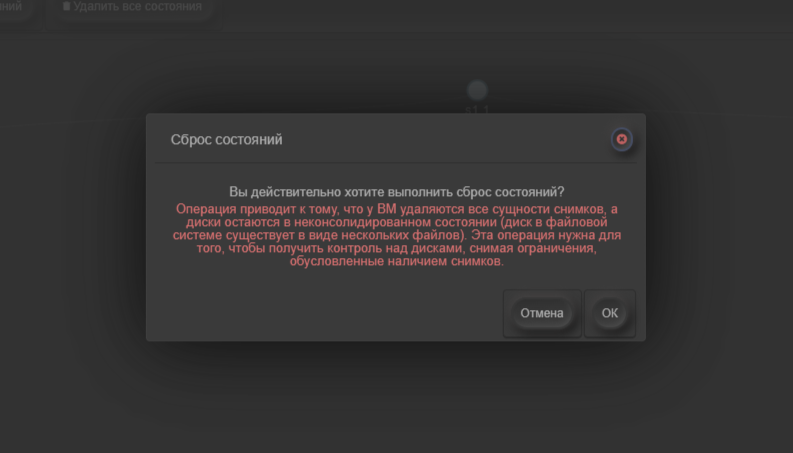 Операция удаляет все сущности снимков ВМ, оставляя диски в неконсолидированном состоянии (в файловой системе диск представлен несколькими файлами). Это позволяет получить контроль над дисками, снимая ограничения, связанные с наличием снимков. Однако без консолидации дисков ВМ не сможет включиться или создать новый снимок. Консолидацию можно выполнить в меню диска. Для сброса состояний необходимо нажать кнопку Сброс состояний в меню снимков.