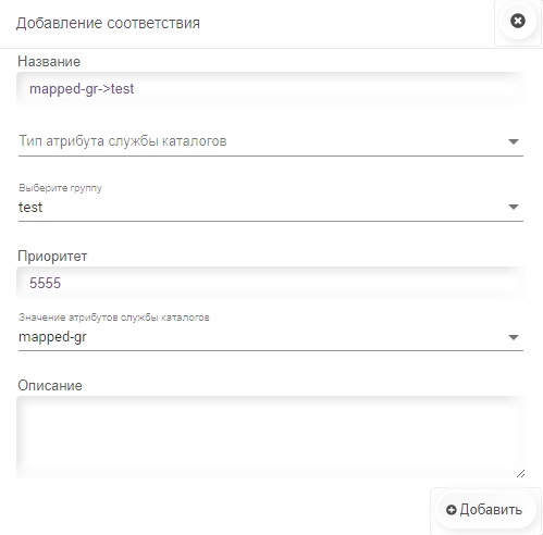 Добавление соответствия производится с помощью кнопки Добавить соответствия в разделе Соответствия созданной ранее службы каталогов. В открывшемся окне необходимо заполнить следующие поля: