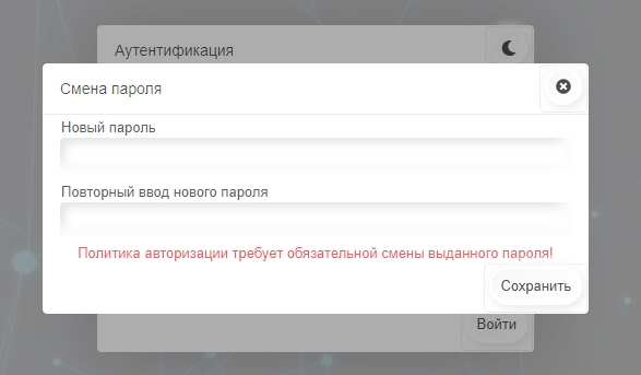 Пользователю, которому выставлено требование смены пароля, при авторизации в Space Disp будет предложено установить новый пароль, соответствующий текущему уровню безопасности.