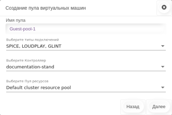При создании гостевого пула все ВМ ВСЕГДА будут являться тонкими клонами шаблона. ВМ имеют ограничения по используемым пулам данных. Подробнее можно ознакомиться в разделе Типы пулов данных.