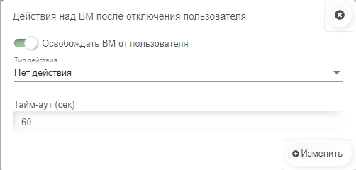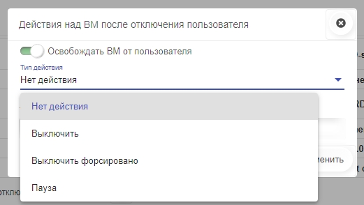 Также можно выбрать дальнейшее действие над ВМ после отключения пользователя: не делать ничего (Нет действия), выключить, выключить форсированно или временно остановить (Пауза). Это переведёт ВМ в выбранное состояние.