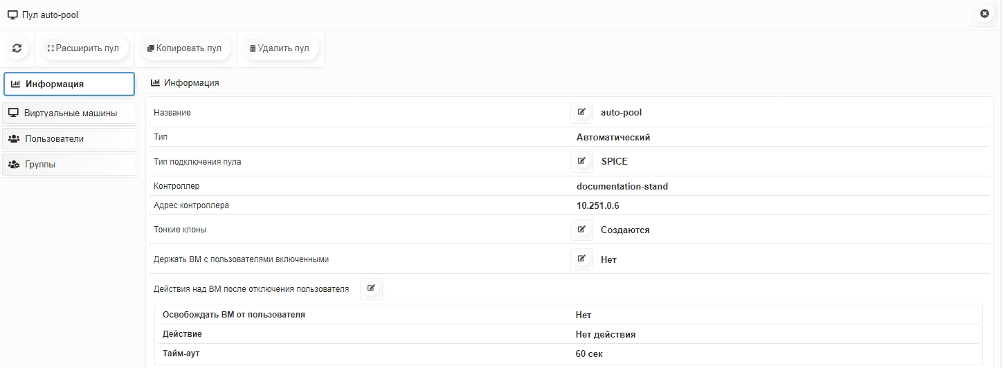 Для автоматического и статического пула имеется возможность освобождать ВМ от пользователя. Для этого необходимо в выбранном пуле перейти во вкладку Информация, далее в поле Действия над ВМ после отключения пользователя нажать кнопку редактирования.
