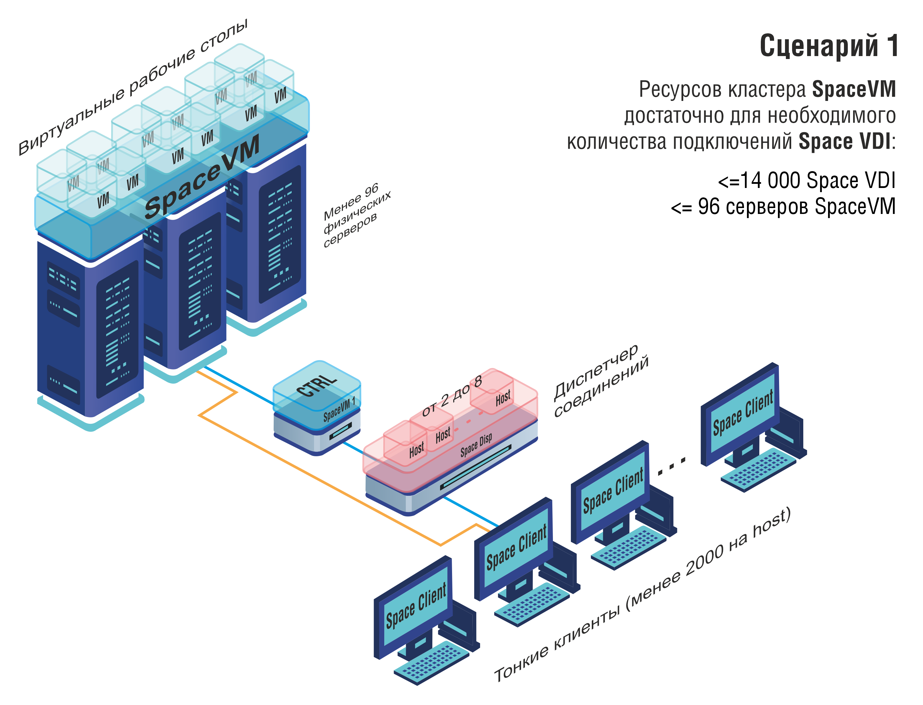 - От одного до семи хостов диспетчера подключений Space VDI в виртуальной машине SpaceVM, при необходимости возможно масштабирование до 14000 подключений.