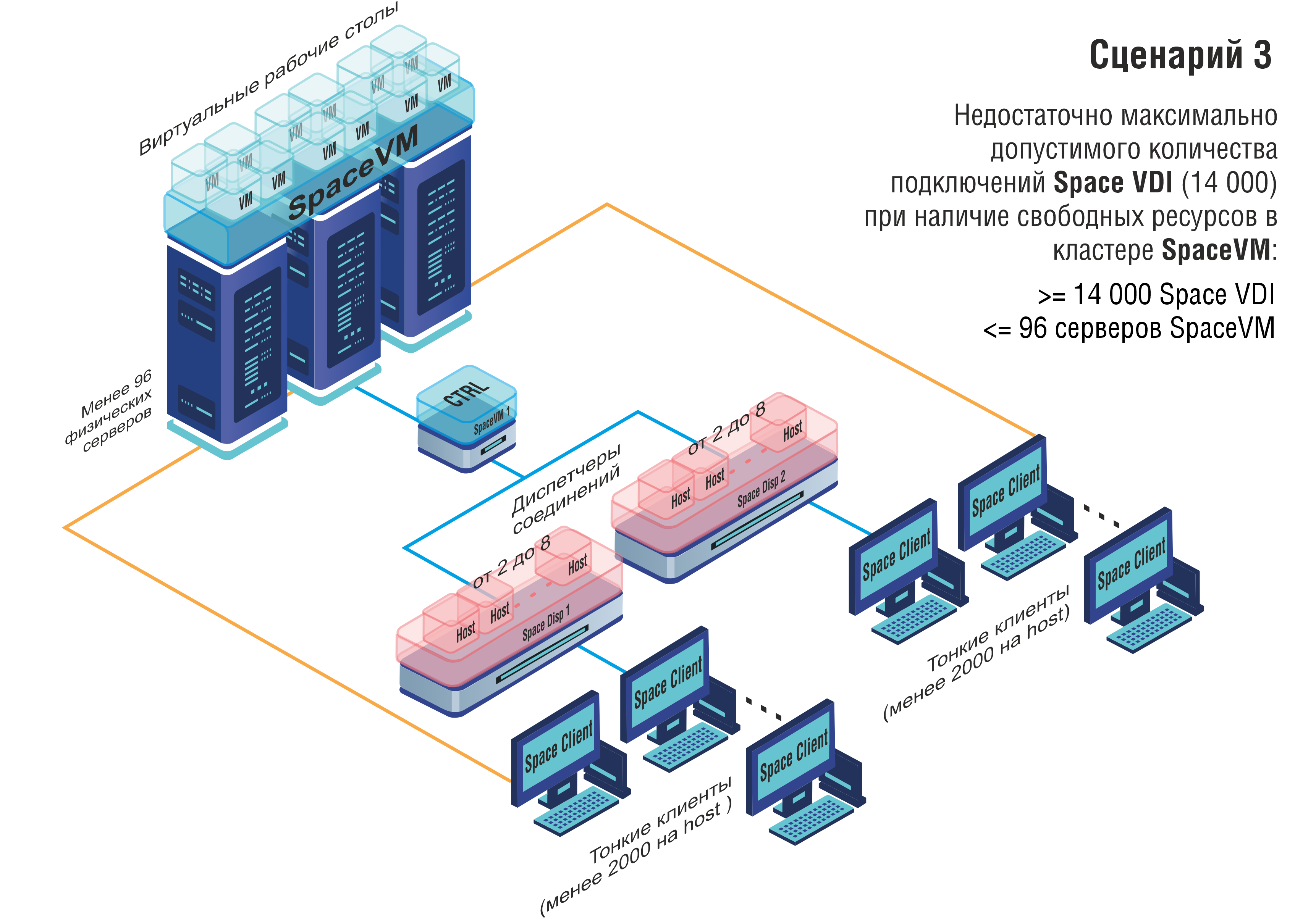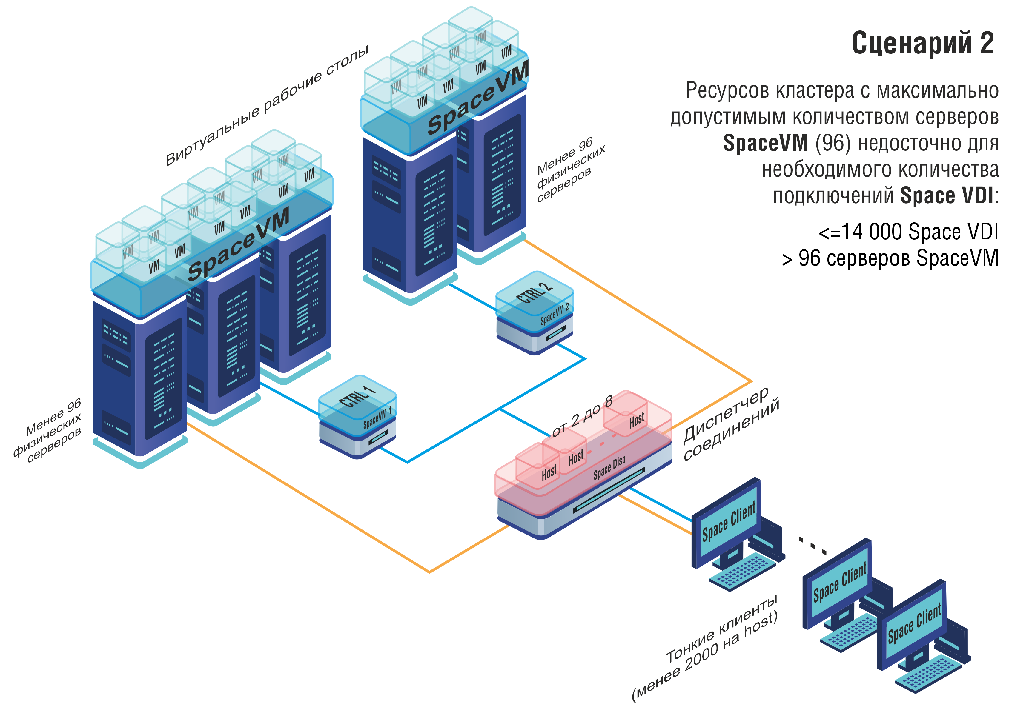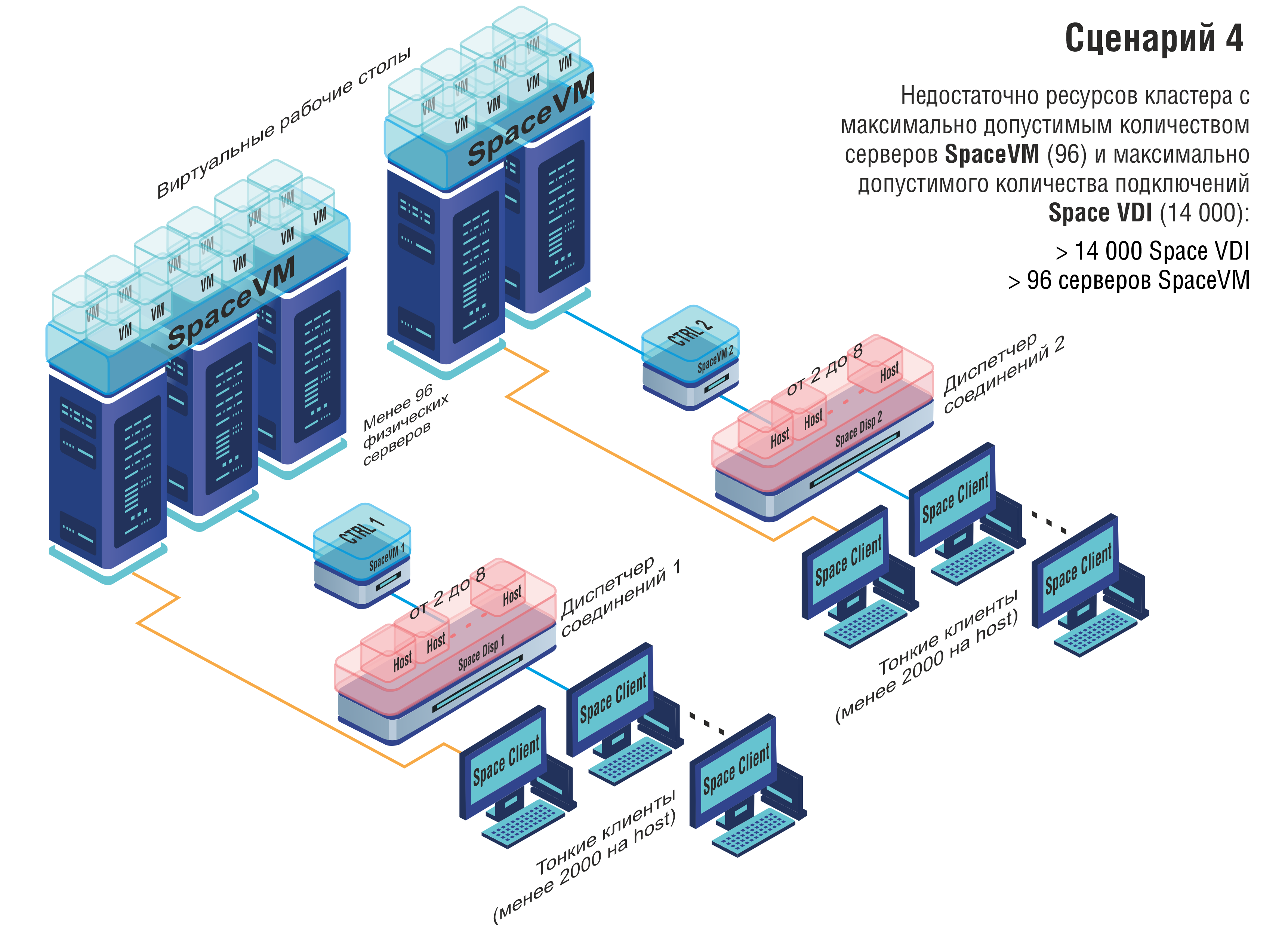 Также возможен обратный сценарий, когда на предприятии недостаточно 14000 одновременных подключений, но в наличии имеются высокопроизводительные серверы или виртуальные рабочие столы не требовательны к ресурсам (когда в среднем возможно запустить более 145-146 виртуальных машин на одном сервере). В таком случае возможно использование имеющихся серверов в одном кластере SpaceVM с подключением двух и более диспетчеров Space VDI.