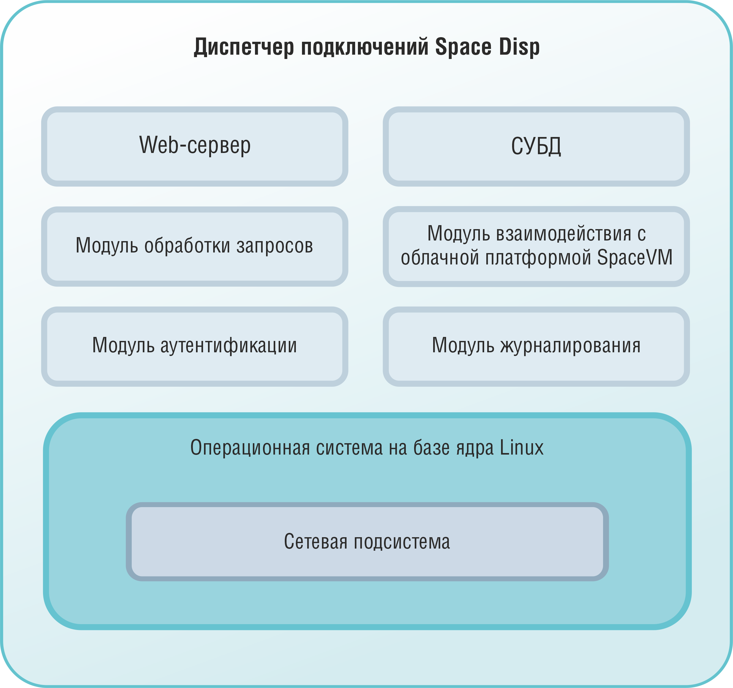 Операционная система на базе ядра Linux. В ее среде функционируют все модули Space Disp. ОС должна иметь возможность установки в качестве гостевой ОС на виртуальные машины SpaceVM. В операционной системе используется сетевая подсистема для обмена сетевым трафиком между изделиями Space Disp, Space Client, SpaceVM по IP-сети.