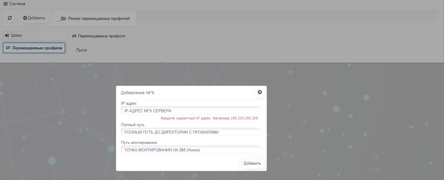 Для работы режима перемещаемых профилей в локальной сети должен быть запущен сервер NFS. На виртуальные машины должны быть установлены QEMU GuestAgent и клиент NFS.