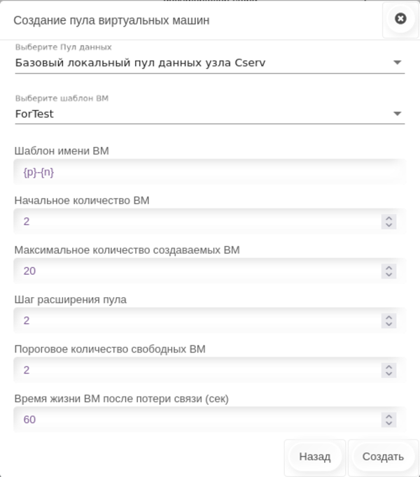 При создании пула указывается время в секундах, по истечении которого, в случае потери связи ВМ с диспетчером, ВМ удалится. По умолчанию: 60 секунд.