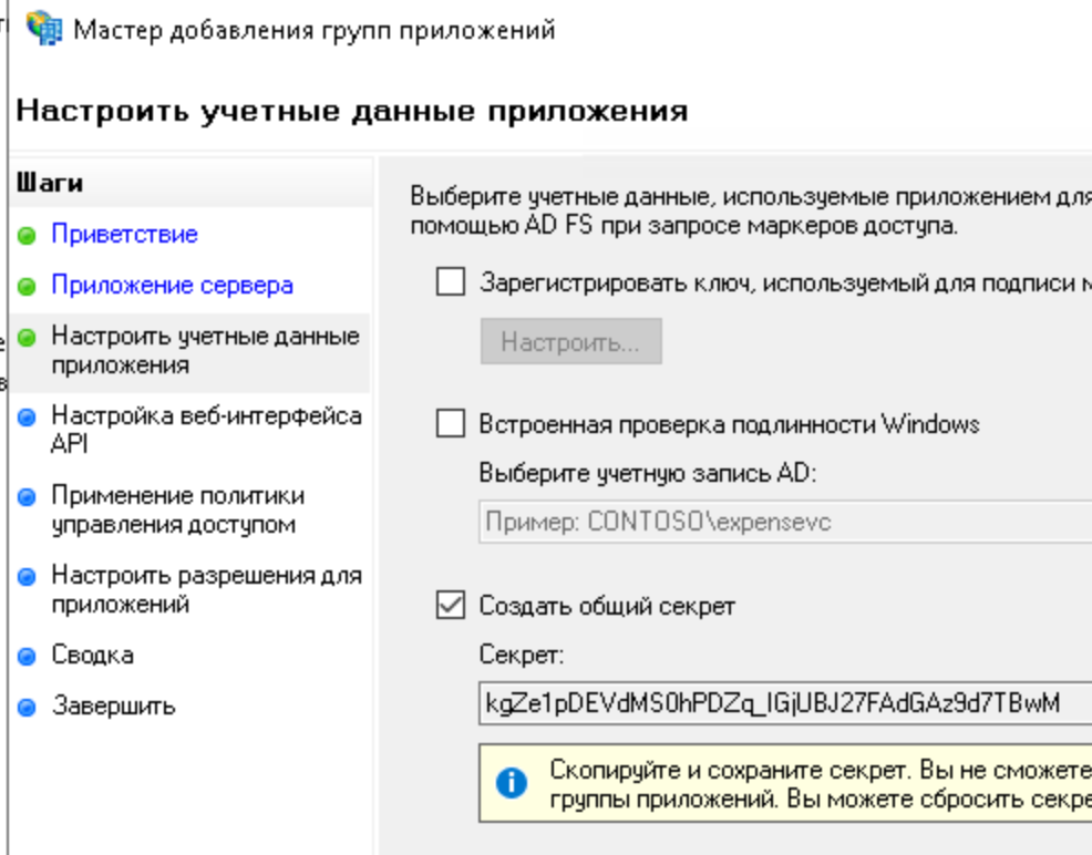 На этапе Настроить учетные данные приложения необходимо выбрать Создать общий секрет и скопировать полученное значение.