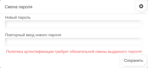 В Web-интерфейсе Администратора безопасности доступна кнопка Смена пароля, которая позволяет изменить пароль пользователю самостоятельно. Далее пользователю необходимо сменить пароль, назначенный администратором безопасности, т.к. требование на смену пароля сохраняется.