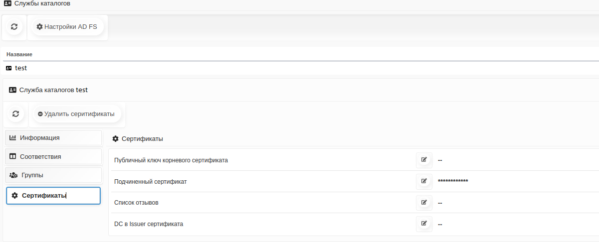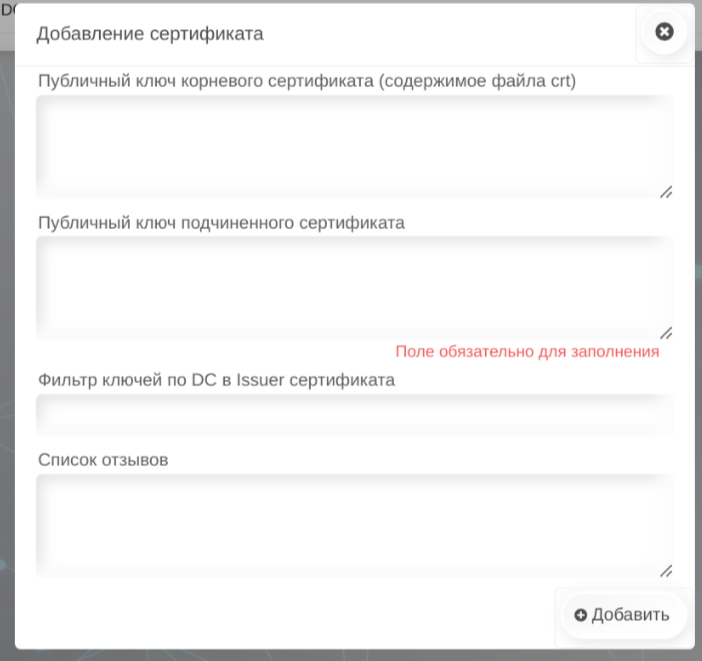 - Если для выдачи пользовательских сертификатов используется только корневой сертификат, то его значение необходимо внести в поле Публичный ключ подчиненного сертификата, а поле Публичный ключ корневого сертификата оставить пустым.