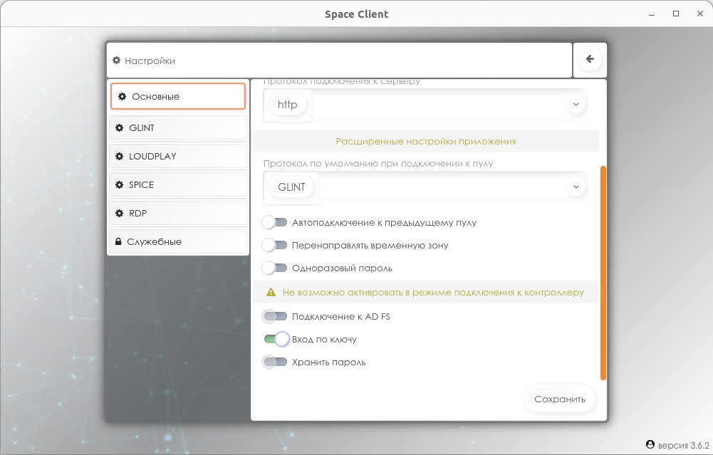 - Установлено ПО Space Client версии 3.6.4 и выше.